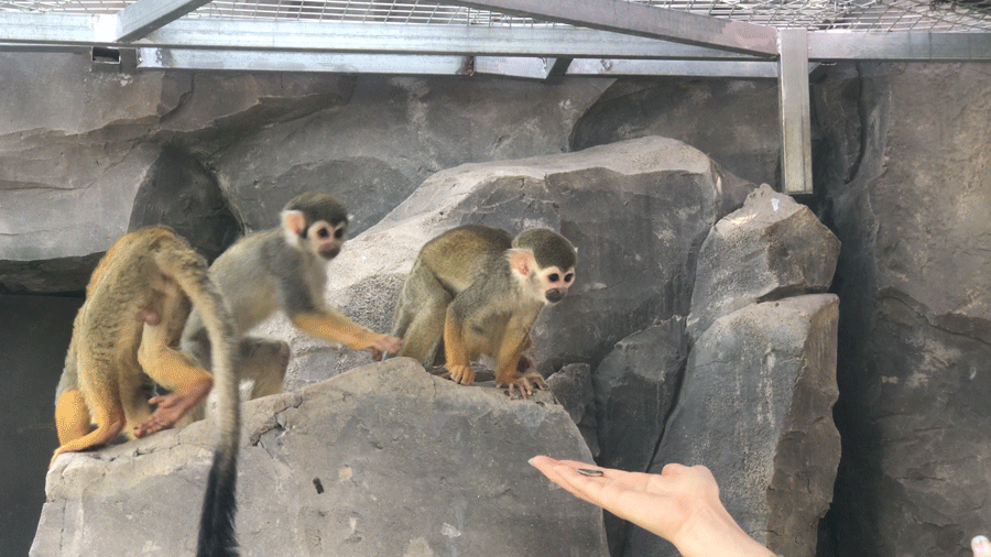 温顺的松鼠猴是个嗑瓜子的小能手,大小朋友纷纷拿起瓜子开始给它投喂美食。