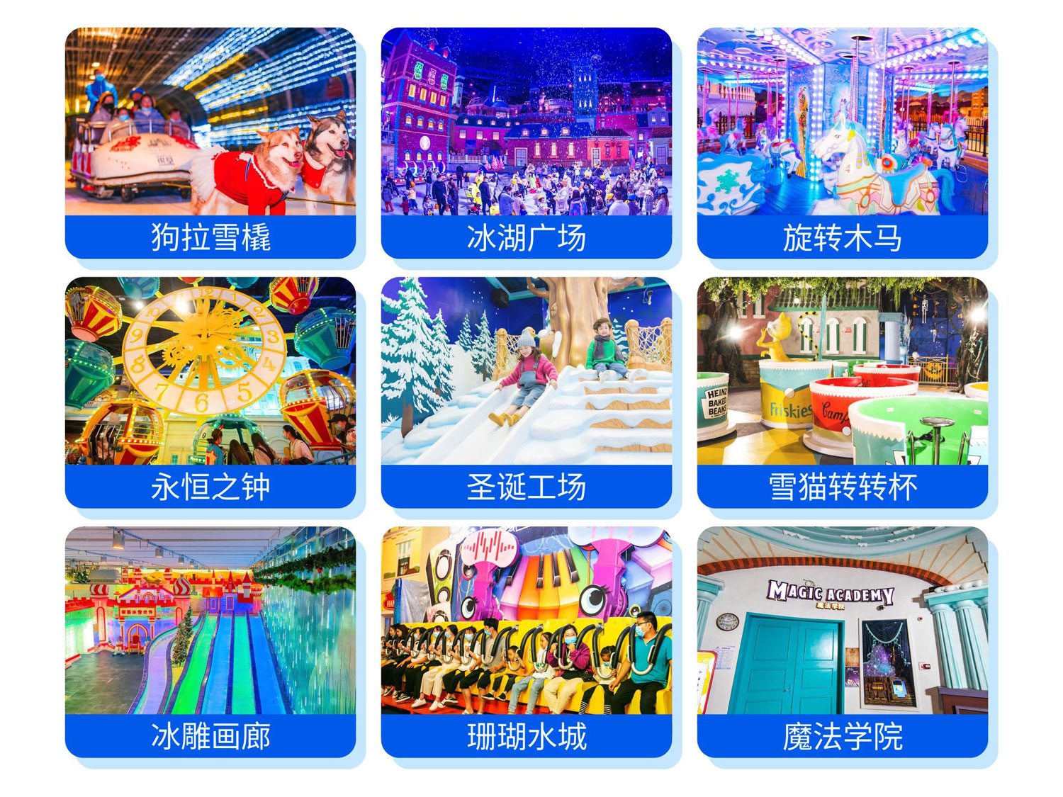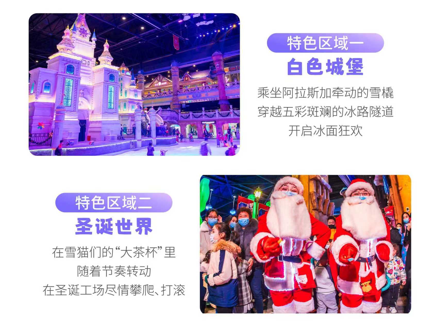 【费用包含]旋转木马永恒之钟(摩天轮)欢跳雪精灵(弹跳塔)雪猫转转杯(转转杯)猫城冒险(过山车)猫咪韵律舞台(长凳)圣诞碰碰靴(碰碰车)BALL HOUSE(泡泡球馆)圣诞工场(软堡)冰雪海盗船魔法学院 雪猫窝(儿童沙地)